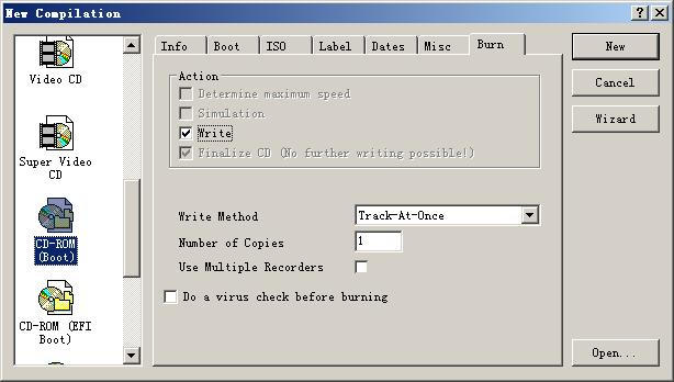 卷标和其它参数都选定后,点new(新建)一张启动光盘的刻录任务就确定完了。
