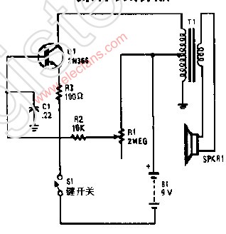 采用以值2N366晶体管和音频变压器等元器件构成音频反馈振荡器,适当调节R1可以得到所希望的音调。
