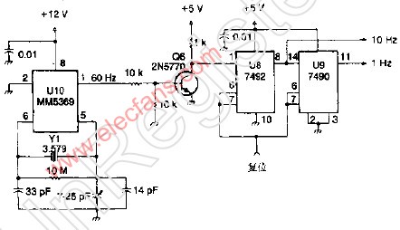 该电路采用MM5369集成块从TV短脉冲群晶振提供的信号中产生60Hz的信号,VR和V9分别由此60Hz信号产生10Hz和1Hz信号,Y1可采用任何并联谐振型3.579MHz的晶体。