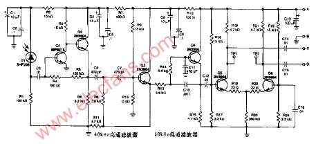 该接收机用来接收载波为50KHZ的调频红外光或可见光光束,Q1、Q2。Q3。Q4形成,有效的滤波器和放大器,差动放大器Q5/Q6用以提高电路的增益