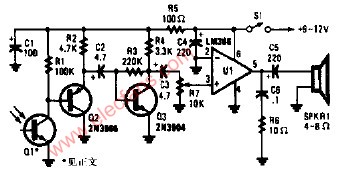 该调幅光信号接收机使用了一个装在抛物面反射镜(为了扩大范围)中的光电三极管Q1。任何NPN型光电三极管均可。射随器Q2驱动放大器Q3.Q3的输出送到音量控制电阻R7和音频放大器U1,给接收机适用9-12V的电源。