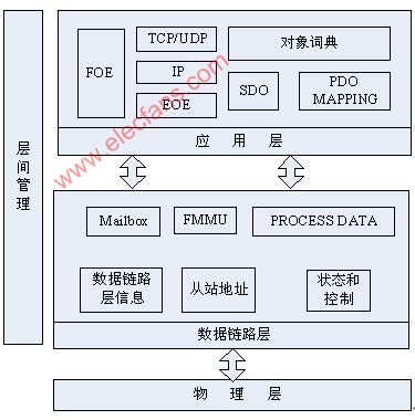 作为一种实时以太网协议,EtherCAT从站的OSI模型可以用图1简单描述。在图1中,ISO国际标准组织所定义的开放系统互连七层OSI模型被压缩成了具有物理层、数据链路层和应用层的3层模型。物理层为网络信号的传输提供了物理链路。数据链路层的主要任务是在特定的“时间窗”内从以太网帧中提取数据并把要输出的数据插入到以太网帧内,同时对数据进行检查校验。如果动作在特定的时间窗内不能完成,就会认为动作失败。应用层的作用是处理数据链路层的请求,并作出适当的反应。