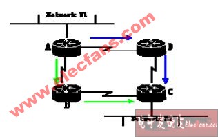 但假如从路由器 A 到 D 的通路出现了问题,那么路由器 A 就不能根据静态路由的指示将报文发送到路由器 D 上去。如果想要保证网络的畅通,就必须由网管员手动配置一条经由路由器B 的静态路由,这样,报文就可以经由路由器 A、B、C ,最后到达目标网络。
