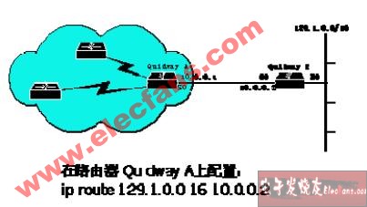 在这个例子中使用 IP ROUTE 命令来配置静态路由:ip route 129.1.0.0 16 10.0.0.2
