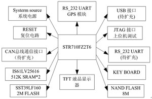 系统以STR710FZ2T6微处理器为核心,采用2片512KB的SDRAM(IS61LV25616)、一片8MB的NAND Flash和一片2MB NOR Flash(SST39LF160)。外部添加了用于接收GPS信号的GPS模块、用于显示的液晶面板以及键盘输入模块。