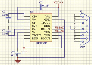 SP3232E是Sipex公司生产的一种RS232接口芯片,使用单一电源电压供电,电源电压在3.0~5.5V范围内都可以正常工作,其额定电流为300μA。只需外接四个0.1μF的电容,保证数据传输速率在120Kb/s下保持RS232输出电平,可以很方便地完成TTL电平与RS232电平之间的转换。