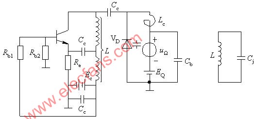 (1)Cj为回路总电容。图7-13为一变容二极管直接调频电路,Cj作为回路总电容接入回路。图7-13(b)是图7-13(a)振荡回路的简化高频电路。