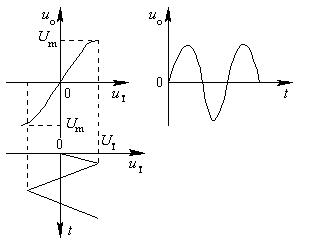 电压比较器输出的是调频方波电压。如要得到正弦调频信号,可在其输出端加波形变换电路或滤波器。图7-23便是由三角波变为正弦波的变换器特性。它是一个非线性网络,其传输特性为