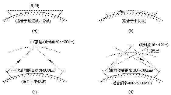 (a) 直射传播; (b) 地波传播; (c) 天波传播; (d) 散射传播