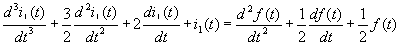 上式即为待求变量为i1(t)的三阶常系数线性非齐次常微分方程。 方程等号左端为响应i1(t)及其各阶导数的线性组合, 等号右端为激励f(t)及其各阶导数的线性组合。 | |||