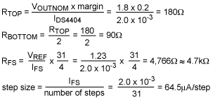 回到最初的例子,计算RTOP使IFS = IDS4404,从VOUTNOM到VOUTMAX提供了31级步长,从VOUTNOM到VOUTMIN同样给出了31级步长,足以满足本例要求。