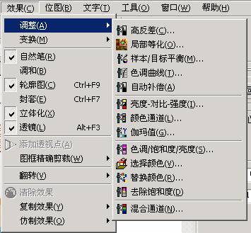 和PhotoShop软件类似,虽然CorelDraw处理的是矢量图而不是位图,仍然可以进行PhotoShop中的各种处理。如下图所示,在菜单栏的“Effect”(效果)子菜单下面,可以找到各种图像处理的选项。