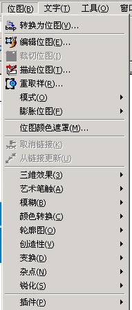 在CorelDraw中,可以将自己制作的矢量图片转换为位图格式。从而可以进行一些只有位图才存在的图像处理过程。在菜单栏的“Bitmaps”(位图)菜单项下可以找到相应的操作。如下图所示。