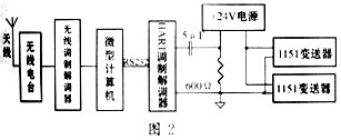 城市中管道煤气分为中压管网和低压管网,若干个调压站分布于城区各处。管道煤气的主要监测任务为进口的中压压力(一般为20~60kPa)和出口的低压压力(一般为1~2kPa)。在调压站处设有监测副站,所设计系统采用问答式工作方式,通信为无线信道,选用Rosemount公司的1151智能型压力变送器,如图2所示,设计了基于HART通信协议的监测副站压力测量方案。