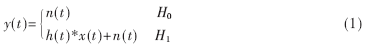 y(t)是认知用户接收到的信号,x(t)是主用户发射的信号,n(t)是加性高斯白噪声,h(t)是信道的增益。在H0假设下,表示没有主用户出现,H1假设表示存在主用户。