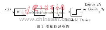 单认知用户感知通常采用匹配滤波器检测、能量检测、周期平稳特征检测[5]。由于能量检测算法是非相干检测,对相位同步要求不高,计算复杂度低,检测时间短,实现简单,所以对单个认知用户采用能量检测。能量检测框图由图1给出。检测的基本假设模型可以描述为: