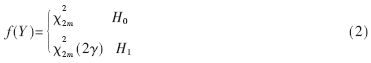 为了测量接收信号的能量,首先接收到的主用户信号x(t)通过中心频率为fc、带宽为W的理想带通滤波,对理想带通滤波器输出信号进行平方运算,并在观测时间内进行积分,并将积分器的输出Y与门限值λ进行比较,从而检测出主用户是否出现。检验统计量Y的分布为[6]: