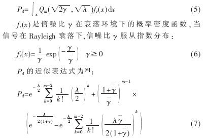 是完整和不完整Gamma函数;Qm( )是普遍Marcum Q函数;从上述公式可以看出,如果Pd很低,将会增大对主用户的干扰;如果Pf过高,就会导致频谱利用率低。当认知用户在衰落环境时,因为Pf是独立于信噪比的,所以Pf不变。由于信道增益h(t)是变化的,所以检测概率与瞬时信噪比有关。表示式为: