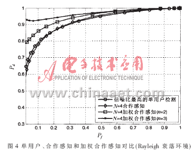 图4中,在Rayleigh衰落环境下,同样从1dB~7dB中随机选取4个不同的信噪比赋给不同的认知用户,传统的合作感知的检测性能与信噪比较好的单认知用户检测性能相差不大。加权合作感知经过第2次感知后其性能要好于传统的合作感知和信噪比高的单用户检测,第3次加权合作感知性能要好于第2次的感知性能。