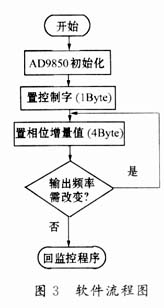 利用单片微处理机可以对DDS的逻辑和输出信号进行实时控制,笔者选用Intel公司生产的MCS-51系列芯片AT89C51。AD9850的CS信号,由地址译码得到,W-CLK和FQ-UD信号直接由89C51的P1口给出。在程序中,需严格按照AD9850的时序要求。其软件流程图如图3(以并行接口方式为例)所示。