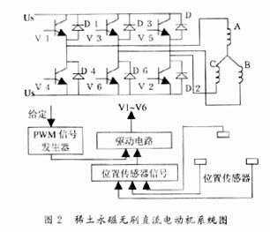 稀土永磁无刷直流电机是一种新型的电动机,其相电势为梯形波,电枢电流为120度矩形波。它的基本构成包括电动机本体、控制器和位置传感器三部分,电机的三相定子绕组分别与作为功率电子开关的桥式主回路中相应的功率开关管连接。由于采用脉宽调制(PWM)控制,所以,电子开关电路由功率开关单元、位置传感器信号处理单元和脉宽调制器组成,用来控制电动机定子各相绕组通电的顺序与时间。位置传感器的跟踪转子与电动机转轴相连接,它将转子磁钢位置变换成电信号,经位置传感器信号处理单元处理后,去控制功率电子开关,使定子相电流随转子位置的变化而按一定的次序换相。随着各相绕组按一定顺序工作,在电机中就产生了旋转磁场,从而拖动永磁转子旋转。