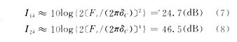 对零均值的离散型杂波,其δC对固定一次对消器和固定二次对消器改善因子的限制:当系统的Fr为1000Hz,δC=13Hz,则有
