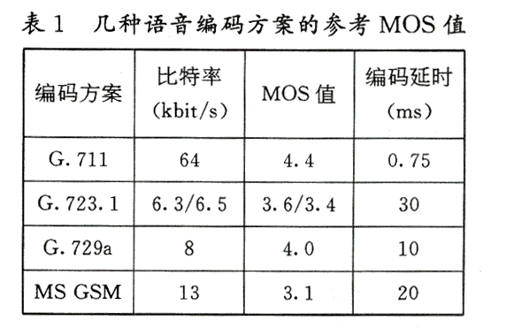这主要取决于所采用的语音压缩编码方案,通常用平均评价分值(MOS,Mean Opinion Score)来评价语音编码的质量,5分为最优,0分为最差。表1列出了几种编码方案的参考评价结果。目前在IP电话中采用较多的为G.729a与G.723.1两种编码方案,从表中所列的MOS值可以看出,前者已接近未压缩的G.711,即一般的PCM编码质量,后者则稍差。