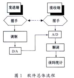 软件是系统的核心部分,完成调制、解调以及对A/D、D/A和握手信号的控制。其工作流程描述如下。