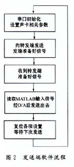 发端将MATLAB产生的调制信号进行量化,并转换成wav格式,D/A转换频率为19.2kHz。流程如图2所示。