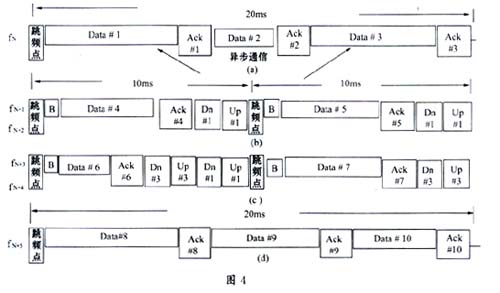 Subfram e),这两种帧分别用于不同的场合。参见图4(a),当网络中只有数据业务时,HomeRF将使用超帧,在一个跳频点上的通信时间为20ms,并且采用异步方式,当网络中有语音业务时,采用10ms的子帧,并增加了一个标志位(图4中的B标志),以同步方式进行通信。图4描述了同时进行语音、数据通信时,帧结构的变化情况。
