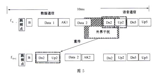 微波炉等等,这些干扰会造成分组包的丢失,为解决这个问题,HomeRF采用了重传的机制,如图5所示,在频点fN处,由于外界的干扰造成语音数据包丢失,于是由CP控制点(ControlPoint)安排在下一个频点的10ms时间里重传。