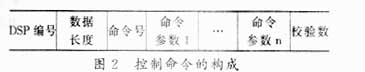 上位PC机发给每个轴DSP的控制命令如图2所示,第一字节为DSP编号,第二字节为数据长度,第三个字节为命令号,其后的字节为命令参数,数据长度不超过10个字节。