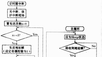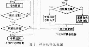 对于上位PC机来说,设定定时中断每隔20ms通过串行通讯口COM1向下位DSP发送指令,如果发送的是要求下位机发送数据的指令,则等待数据上传结束,对数据进行校验,如果校验出错,则发送重发指令,继续等待数据上传,反复3次,如果还是出错,显示通讯失败,退出中断。下位DSP接收数据采用查询的方式,它对接收的数据进行校验,如果校验错误,置接收状态数为假。DSP的数据发送则由上位机控制,发送固定长度的数据(包括实时数据以及状态数据,长度7字节),数据末尾加入校验数,实现与上位机多机串行通讯。当上位机读出下位DSP上次接收状态出错,则再次重复发送上次的指令。上位机可以采用Visual C++,下位DSP可以采用C语言与汇编语言混合编程,这样实现起来方便,且效率较高。图4分别给出上位机的定时中断与下位DSP接收数据的流程图。
