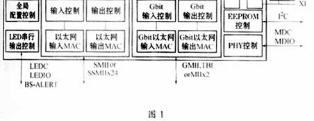 在EEPROM中存储有初始化配置数据,全局配置模块中存储交换机运行时的关键数据和全局信息;CPU-I/O控制提供芯片和CPU之间的接口,可以通过DMA方式与16位CPU(如80186,ARM等)接口,也可以通过IDE接口与8位CPU接口(如8051);LED控制器将交换机状态通过送出串行数据送出驱动LED显示;BSF控制模块中存放进行广播的包;SRAM控制器存放了所有控制数据和包数据的访问请求。