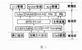 由于这是一种网管型的交换机,交换机的软件除了完成对VT6526等芯片的驱动控制外,还需支持相关的第2层协议和部分第3层协议以提供完善的网络管理功能, 网管软件是交换机的重要组成部分,也较为复杂,该网管软件的功能层次图和基本流程图如图3和图4所示。图3中,CLI是主叫线路识别,SNMP是简单网络管理协议,IGMP是Internet组管理协议窥探。图4中,UDP是用户数据报协议,STP是信令转发。