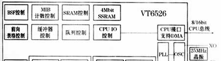 VT6526是***威盛公司(VIA Technology Inc.)生产的一种低功耗、无阻塞共享内存进行存储转发的第2层单芯片交换集成电路,它以线速提供24个10M/100Mbps端口和2个10M/100M/1000Mbps端口。图1是它的原理方框图。图1中,BSF是基准频率,MAC是介质访问控制,MIB是管理信息库,其余如,LEDC、LEDIO、BS__ALERT、SMII、SSMIIx24、GMII、TBI、MIIX2等都是接口协议。