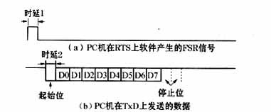 (1)初始化。(2)软件置RTS=‘1’,产生FSR信号的上升沿。(3)软件时延1。(4)软件清RTS=‘0’,产生FSR信号的下降沿。步骤(2)~(4)产生一个完整的FSR脉冲信号(见图3a)。(5)软件时延2(见图3b)。(6)写数据到发送数据寄存器。(7)重复步骤(2)~(6),发送下一个字节的数据。