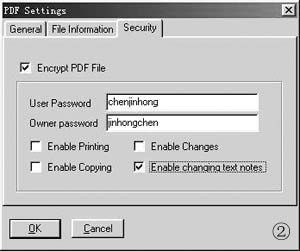 4、加入版权信息或保密功能,点击“File→PDF Settings”,按图1所示设置。为了防止他人盗窃你的成果,你可以给PDF文档加密,点击“Security”选项卡,如图2,复选“Encrypt PDF File”后输入密码就可以了。