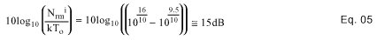 The increase in noise floor in the presence of a blocker is attributed to the degradation in signal-to-noise ratio output of the mixer from Ntho to Nbl. The noise floor (Nbl) measured by the spectrum analyzer has noise contributions from thermal, reciprocal mixing noise, SAW and IF amplifier. The mixer's effective NF is increased from 9.5dB to 16dB for cascaded block analysis to account for the measured total output noise power. From the composite noise (Nbl), the reciprocally mixed noise Nrmi can be extracted by using the Equations developed in the mixer noise section. The signal-to-noise degradation represented in Equation 3 is 16dB. Solving for Nrmi in Equation 3 results in