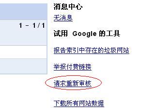 1 使用Google 帐户登录网站管理员工具:https://www.google.com/webmasters/tools/。在控制台页面右侧的工具列表中,点击请求重新审核并按说明操作。