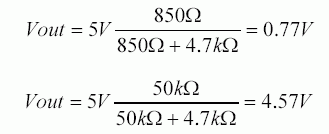 Using a 4.7kΩ resistor, the output voltage range is 0.77V to 4.57V over the resistor range of the 50kΩ resistor.