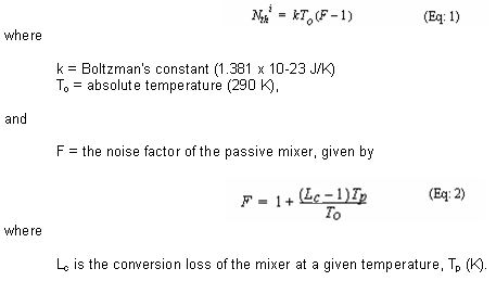 在接收混频器中,常常关注的噪声是热噪声。用它说明混频器的噪声性能,该混频器带有一个50Ω匹配阻抗的RF输入,噪声功率密度为-174dBm/Hz (kTO)。输入热噪声可根据混频器噪声系数(10log10F)的定义求得。