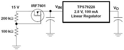 由于制造工艺的原因,所有 IC 都有一个输入电压极限。当您想要使用 dc/dc 转换器(例如:线性稳压器)将高电源电压调节为较低的稳定电压时,这种电压极限就显得较为不便。添加一个 FET 至线性稳压器的输入端,就可以创建一个 dc/dc 转换器,其具有比单独使用稳压器更宽的输入电压范围。过电压(以及随之产生的功耗)在 FET 上被降低。图 1 显示了 TPS79228 2.8-V、100-mA、低噪声、高 PSRR LDO 稳压器输入端的 IRF7601 N-通道 MOSFET。两个电阻器为 MOSFET 栅极提供了一个偏置电压,负载电流决定了 MOSFET 源上的电压(即电阻 FET 导通电阻调节满足负载电流需求)。MOSFET 的选择基于三个标准:漏—源击穿电压、栅极驱动要求和功耗性能。在本例中,最大电源电压为 15V,而 TPS79228 拥有一个 5.5V 的建议工作输入电压最大值,因此选择了一个具有 20V 击穿电压的 MOSFET。