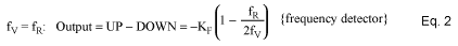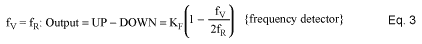 Equations 1, 2 and 3 phase/frequency detector transfer functions when inputs are at the same frequency (lock condition) and at dissimilar frequencies (fV > fR and fV < fR respectively).