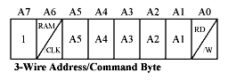 led high by the master comprise the Address/Command Byte, which tells the RTC if the data transfer is a read or a write and which register will be read to or written from. A typical RTC Address/Command Byte is shown below: