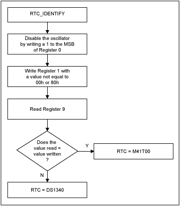 如果写入固件应用于任一RTC,附加寄存器可用来识别正在使用的器件。M41T00会混淆间隔为8的地址寄存器设置。也就是说,寄存器0可以在地址为0H、8H、10H、18H...时被访问。DS1340-33不存在这种问题,因为它在地址8H 与9H有独特的寄存器。在本应用笔记的末尾给出了识别所用RTC的流程图。