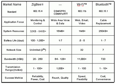 图 1 — 无线协议参数及其重点应用领域(ZigBee联盟提供)