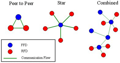 这些拓扑结构均由可实现三种逻辑抽象功能之一的 802.15.4 FFD 和 RFD 节点提供支持。必须为 FFD 的ZigBee 协调器将启动网络和管理网络连接与安全密钥等大多数网络参数,是路由消息不可分割的组成部分。ZigBee 路由器也必须为 FFD,负责转发往返于其他网络节点的消息,并实现 ZigBee 网络的网状网特性,同时扩展网络的总体覆盖范围。ZigBee 协调器与路由器一般由主电源供电,因为它们应能够在任何时间接收和传输消息。如果预计应用的数据传输是周期性的,则 ZigBee 也可以采用 802.15.4 同步网络的TDMA 消息传输协议。ZigBee 终端设备以 RFD 方式实施,可以最大限度地减少其占空比和资源要求,从而实现采用电池供电并长期工作的目的。