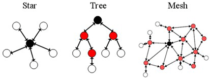 点对点网络拓扑支持网络上不同节点间的单向或双向链接。只有节点处在连接范围以内时才会相互通信,因为保持直接的物理链接是其通信的必要条件;唯一的例外是广播消息,其可以通过网络重复广播传播。树状网络拓扑中,每个网络节点都与其父节点相关联,网络寻址也会反映出这种节点关系,这与 IP 因特网地址非常类似。这样,我们就能实施更加有效的路由算法,因为更多的节点网络地址位数可以反映出某个节点相对于其对等节点的关系。星形网络可将单个节点视为网络协调点,负责各种可能的网络管理控制工作,如节点关联、节点网络加入与链接许可、消息转发以及安全交换等。星形网络依靠协调点来保持网络通信,如果协调节点出了问题,网络通信也会受到影响。