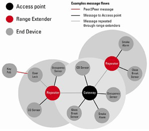 从最基本的意义上说,网状网络是指每个节点至少要有两条连接路径的网络。而全网状网络是指每个节点都有到其它节点的直接连接的网络。全网状网络在许多情况下是不合理的,因为这很快就会将网络规模限制在连接能力最弱的设备所覆盖的最小网络范围内,而网状网络的要求又过于严格。然而,人们会在两种情况之间找到某种折中,通过某个中央节点发起网络,用树状寻址技术来定位节点并管理节点间的关联关系。范围扩展器也称路由节点,可在网络中发送消息,如果一个节点或协调节点出了问题,网络仍能继续正常工作,只是会在一定程度上影响操作性。自愈路由发现以及路由过期 (route expiration)等其它优异特性可提高路由算法的可靠性与效率。
